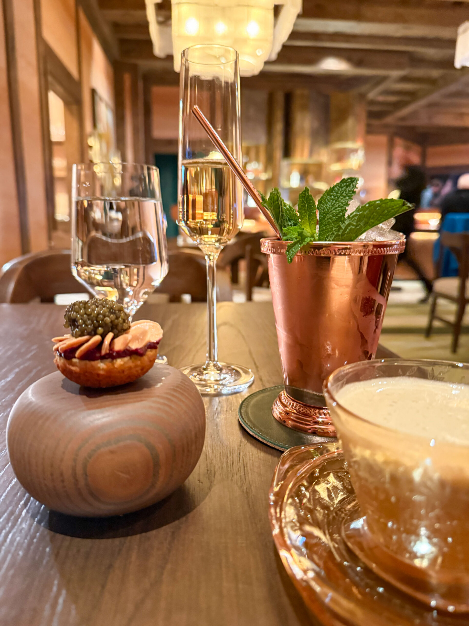 I’m beginning to see the chef’s vision in this pairing. There is the element of surprise through the innovative use of alpine inspired ingredients, and both overt and subtle luxury. But despite the ways they lit my brain with its newness, each dish was, at its core, warm and comforting. M’s almond-brown butter financier with its fermented blueberry butter and sliced almonds transports me to my grandmother’s holiday cookie table. It’s essentially a thumbprint cookie, though I can’t say I’ve had a thumbprint topped with caviar. And sure, the froth and infusion added umami and herbaceousness, but the apple broth is essentially warm apple cider.