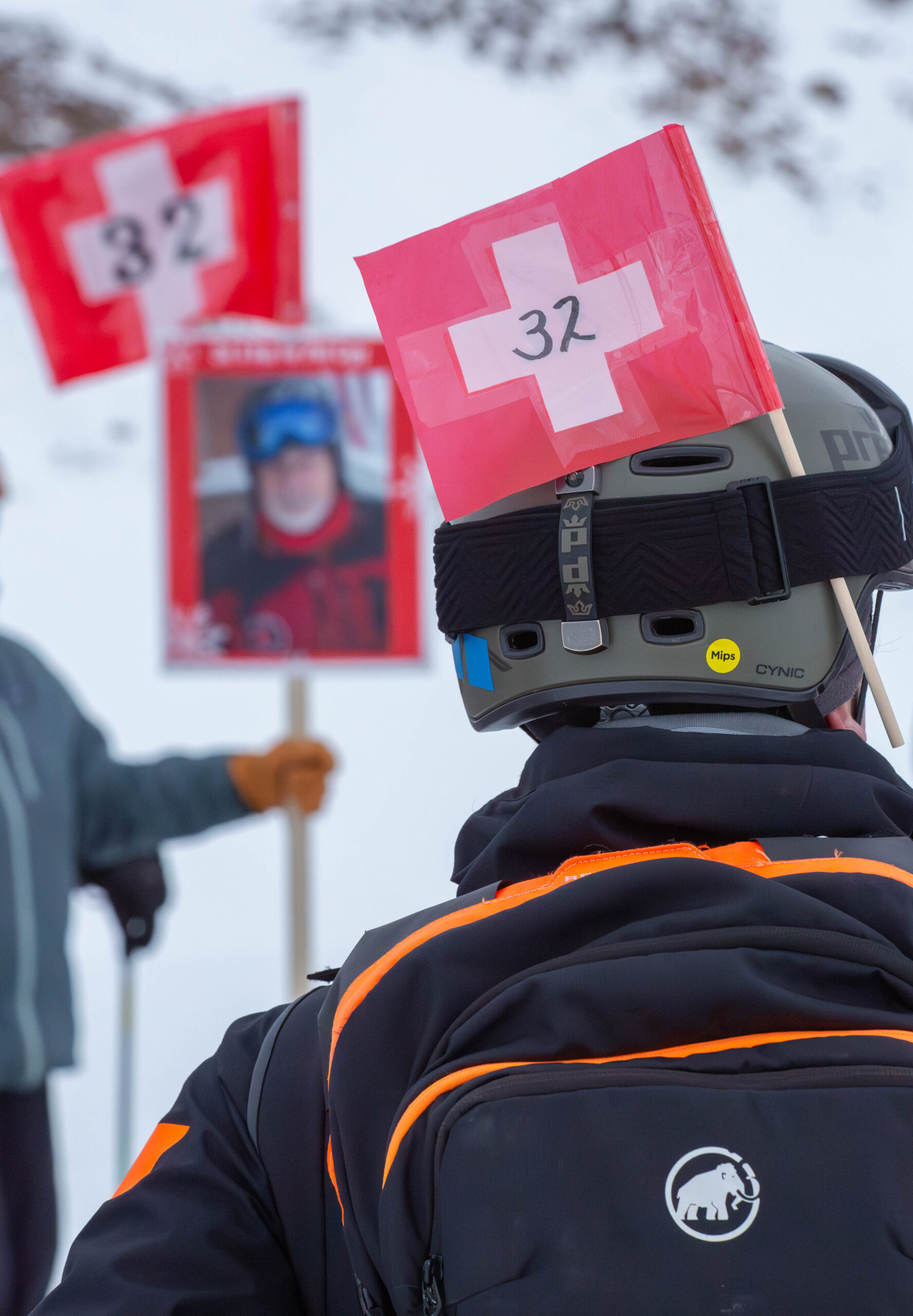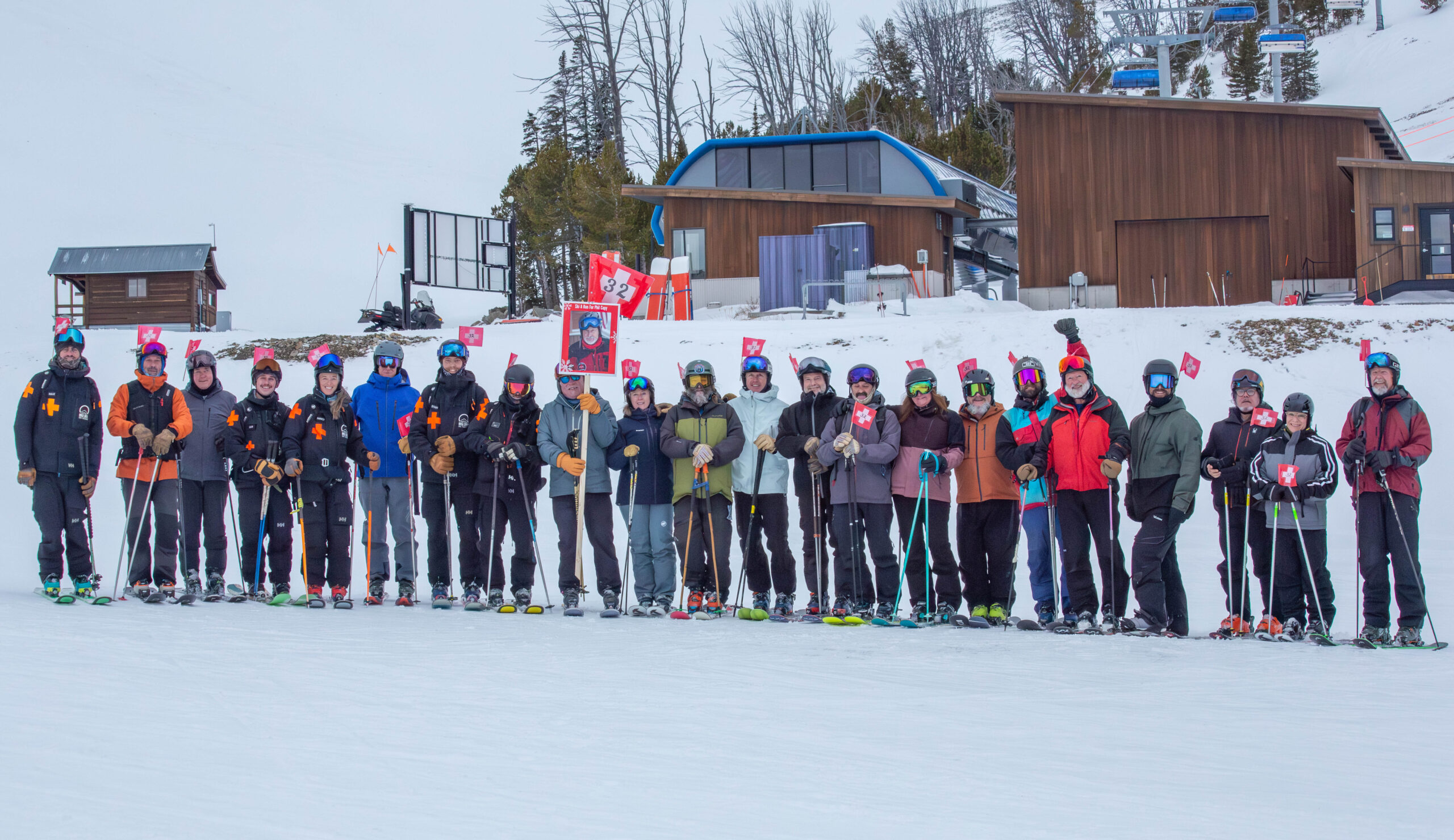 A sudden gust of December air fluttered two-dozen miniature plastic flags, adorned with the ski patrol symbol and the number 32—the radio number of legendary Big Sky ski patroller Phil Capy.