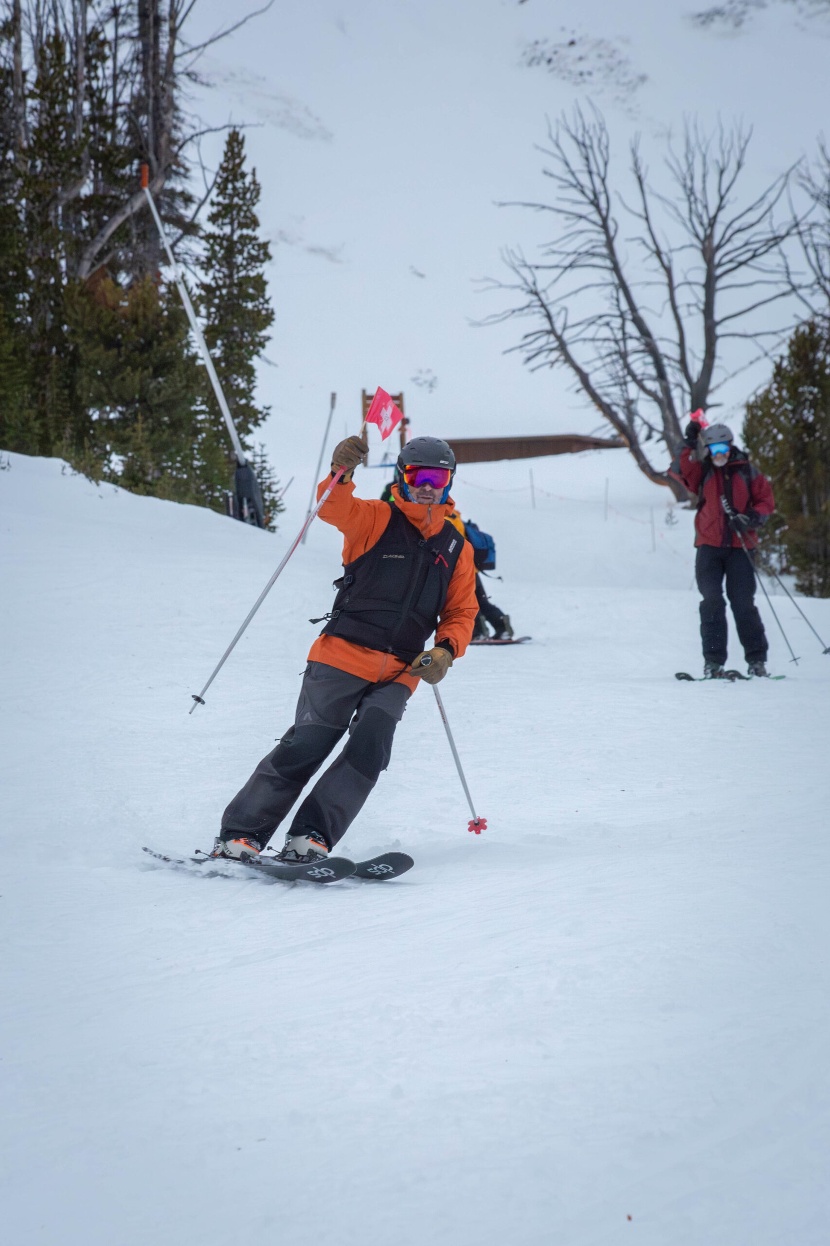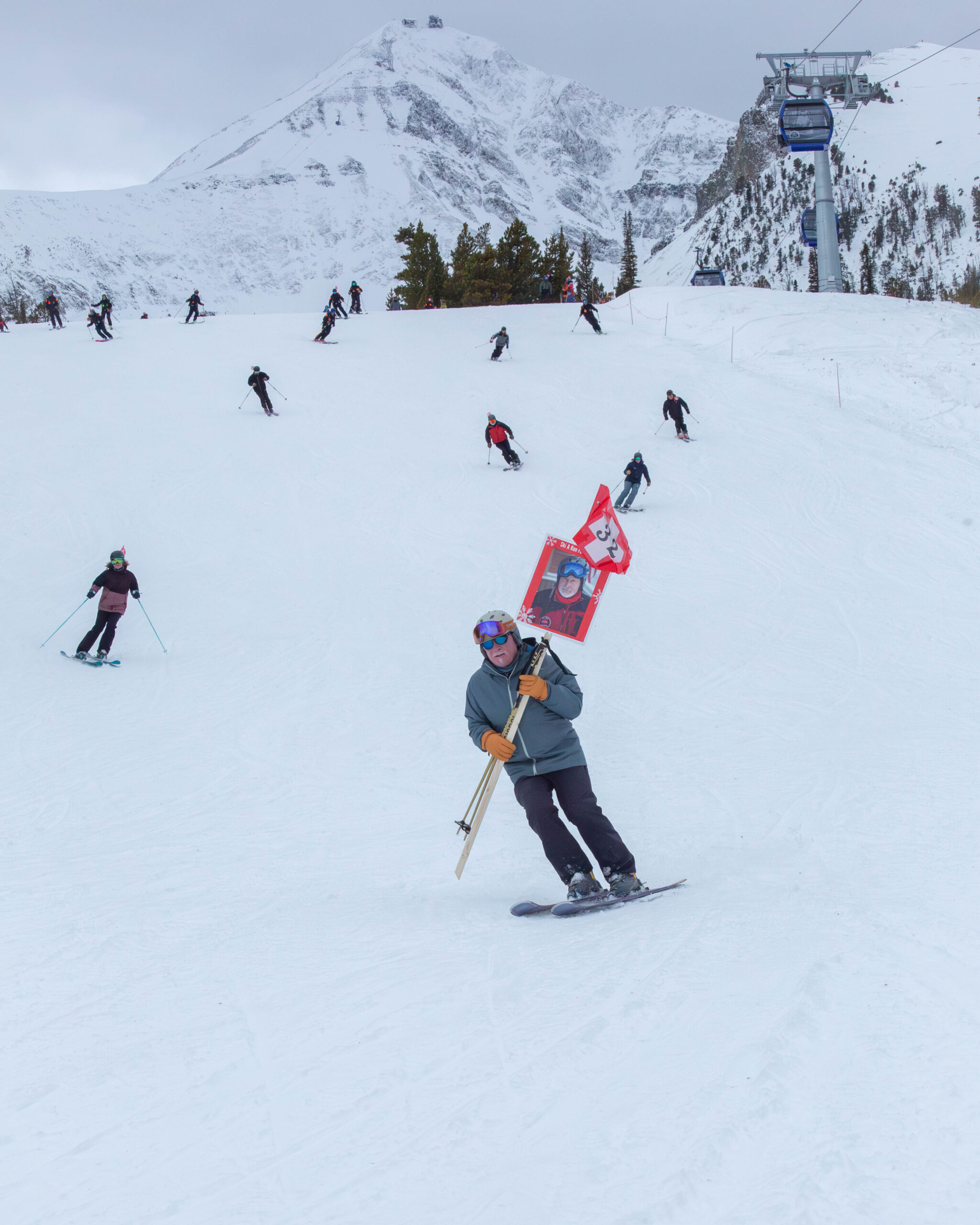 Humphries, who patrolled Big Sky Resort from 1995 to 2017, held a larger version of the same flag, affixed to a poster of Capy’s face. A crowd of Big Sky Resort Ski Patrol staff and nostalgic retirees followed Humphries, with flags carried in hand and tucked into goggle straps, beginning a memorial lap down Mr. K on Dec. 10.