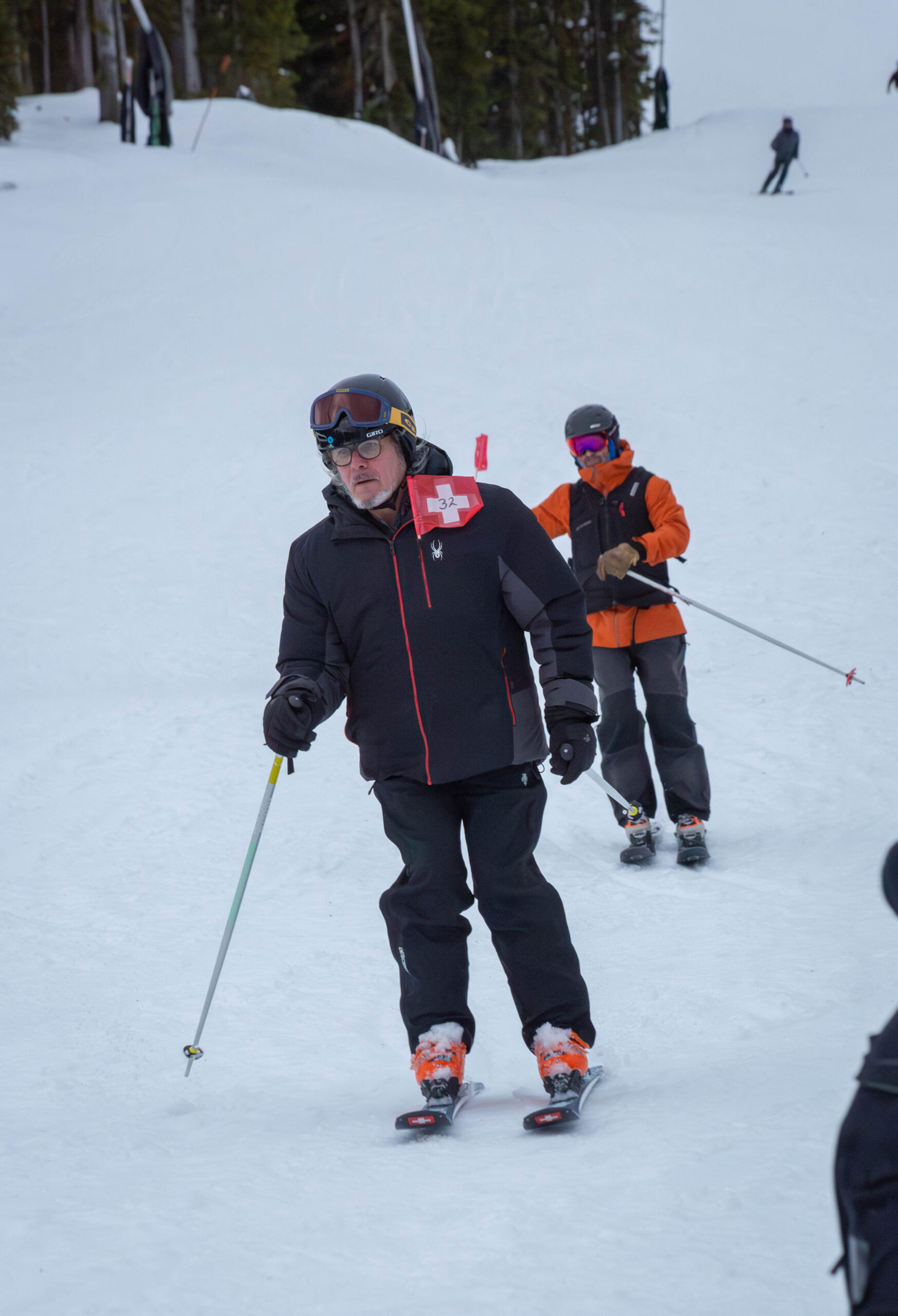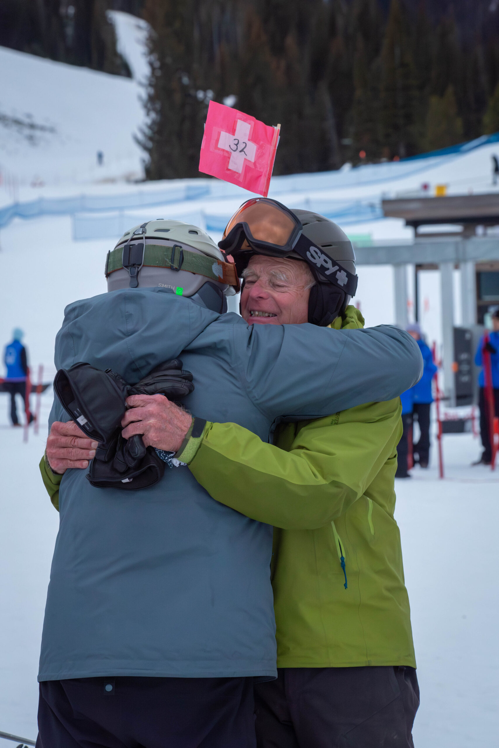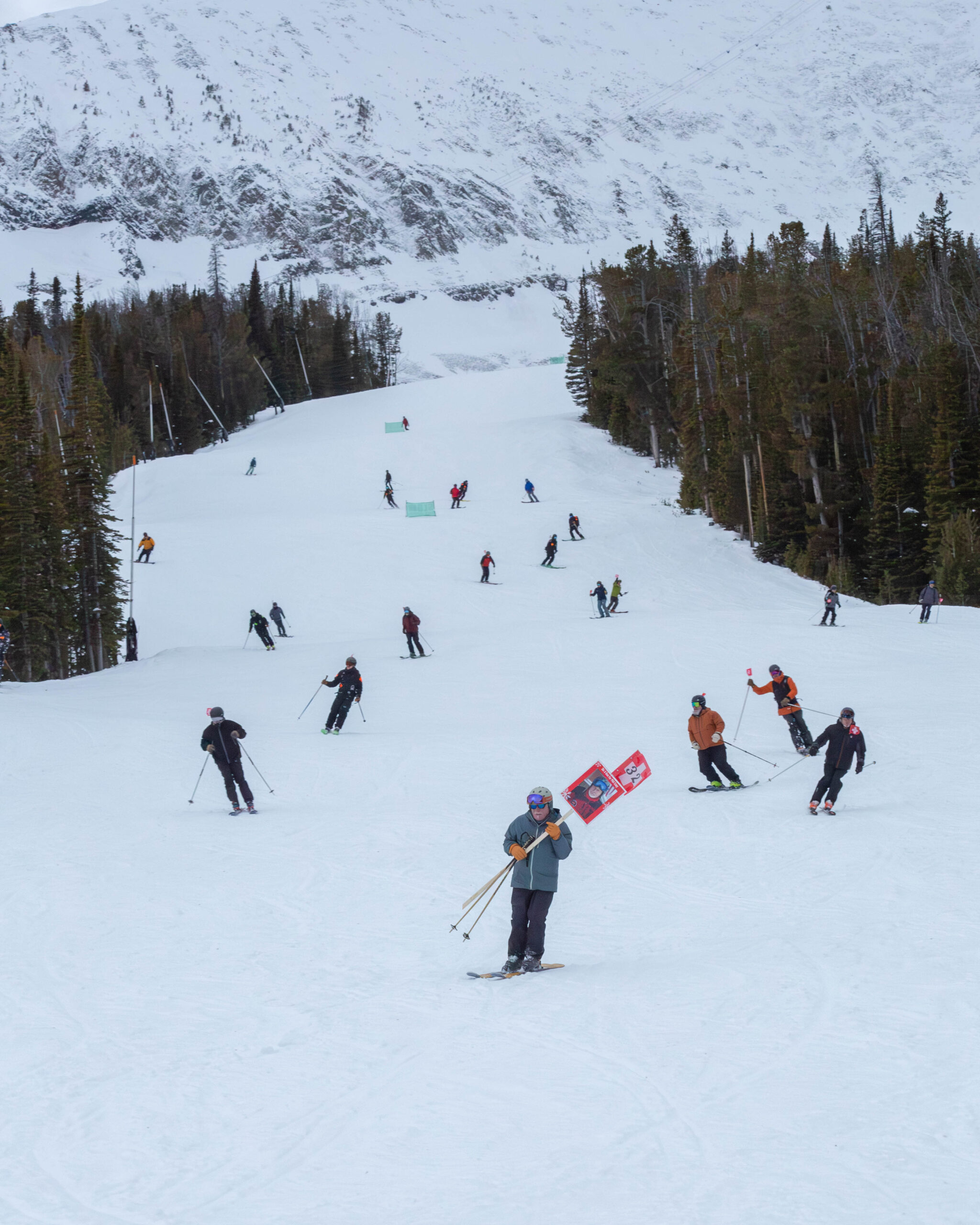 After arcing leisurely turns down the iconic green trail, Humphries spotted Capy’s partner, Linda Herrick, waiting by the ski racks. With a hug, he handed her the seven-foot flag.