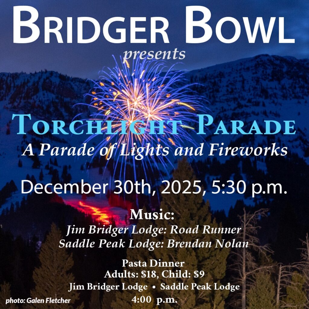 On Thursday, Dec. 30, Bridger Bowl Ski Area will ring in 2026 with their annual torchlight parade and fireworks celebration. Starting at 4 p.m., enjoy a family-friendly spaghetti dinner at both Jim Bridger and Saddle Peak lodges and live music by Roadrunner and Brendan Nolan. At nightfall, Bridger Bowl Snowsports instructors will snake down the hill holding torchlights, followed by a fireworks display in the base area.